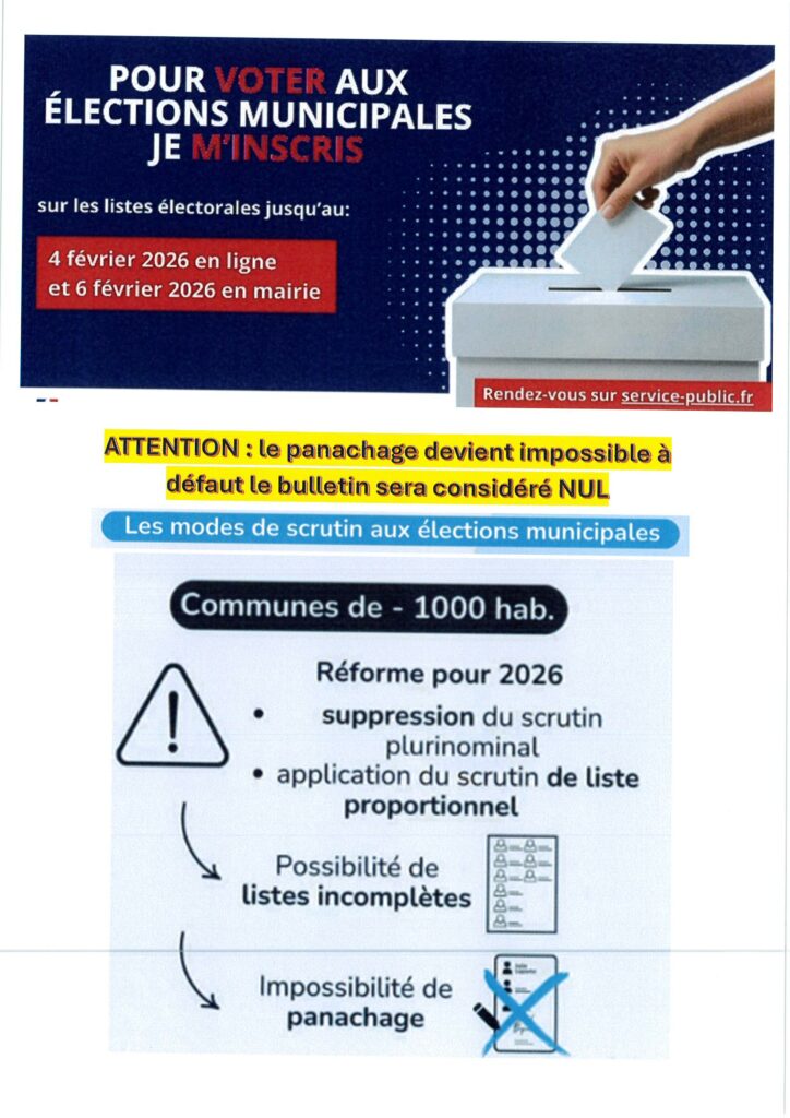 Les élections municipales se dérouleront le 15 et 22 mars 2026. Vous pouvez vous inscrire sur els listes électorales jusqu’au 4 février 2026 en ligne sur le site service-public.fr https://www.service-public.gouv.fr/particuliers/vosdroits/R16396 ou en mairie jusqu’au 06 février 2026. attention le panachage est désormais impossible pour les communes de moins de 1000 habitants, à défaut le bulletin […]