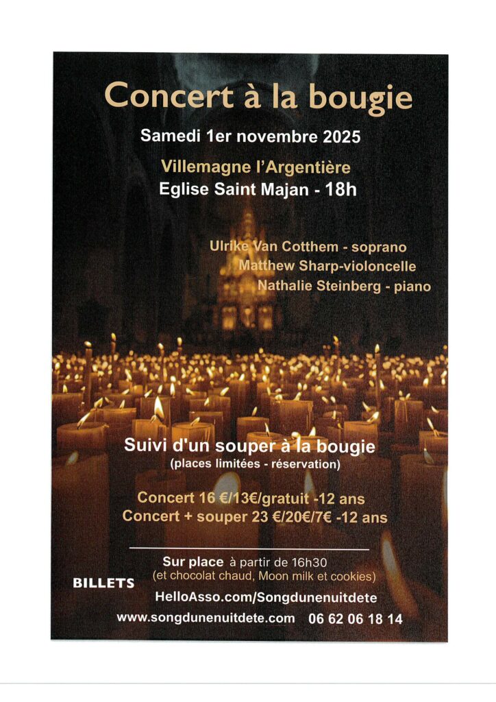 samedi 1er novembre A 16h30 – chocolat chaud – moon milk – cookies A 18h – concert à la bougie – Eglise suivi d’un souper à la bougie concert 16 € Souper 23 € inscription 06.62.06.18.14